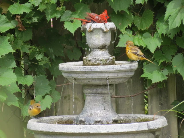 It's been quite the summer of heat & humidity!! We don't think we've seen as much action around our fountain & bird baths....ever! The entertainment has been fabulous and the sharing...spectacular! On this one day, it was pretty special to see a Cardinal in the top of our fountain only to be joined by a couple of Baltimore Orioles on the lower levels...priceless!!