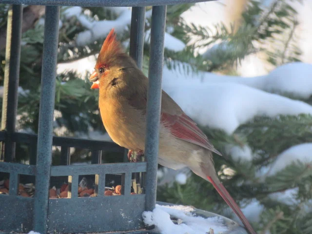 While we’re not as cold as some places in the country, or in the province, it is fairly chilly and expected to stay this way for a bit. Just a reminder following the rain earlier this week to make certain that your seed didn’t get wet in your feeders. If it did, it could now be frozen and will not be flowing properly. As well, clear deeper snow from below feeders so those that feed from the ground can get to the seed that might be there. If possible, place feeders where they might have more protection from cold NW winds. As usual, we have propped our Christmas tree beside a garden tree so that it offers a little extra shelter near some of our feeders.