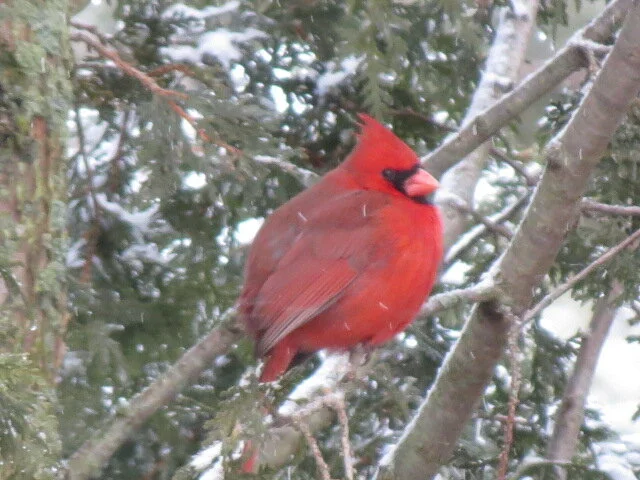 When the snow arrives, so do the Cardinals….they’re like jewels in the trees brightening each winter day!